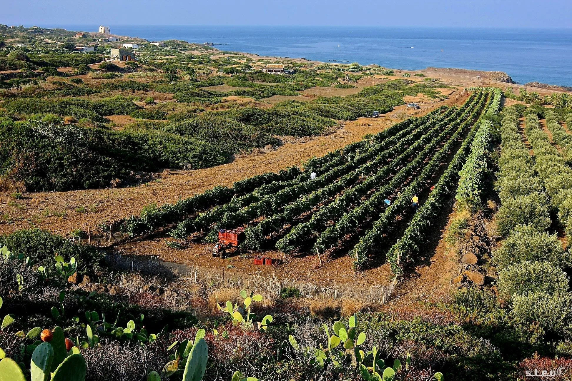 Malgré des pluies rares et des températures élevées, les vignes prospèrent grâce à la richesse minérale du sol et à la brise marine qui tempère les excès climatiques. Les plantations se composent exclusivement de cépages siciliens autochtones implantés depuis toujours sur l’île : Zibibbo, Catarratto et Inzolia. Les rendements sont naturellement faibles (20 hl/ha), gage de concentration et de qualité.